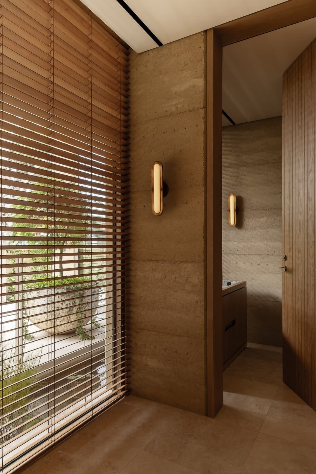 A defining feature of the architecture is its dynamic response to the environment. The integration of high-performance Evaya ev80 external venetian blinds within the deep rammed earth reveals allows the facade to actively moderate sunlight, heat, and privacy. When lowered, the blinds present a continuous horizontal texture that complements the stratification of the rammed earth. When tilted or raised, they dissolve the boundary between the refined interiors and the verdant courtyards beyond.